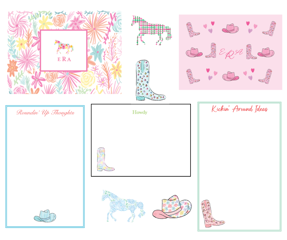 Colorful and bold Western styled stationery and notepad designs.