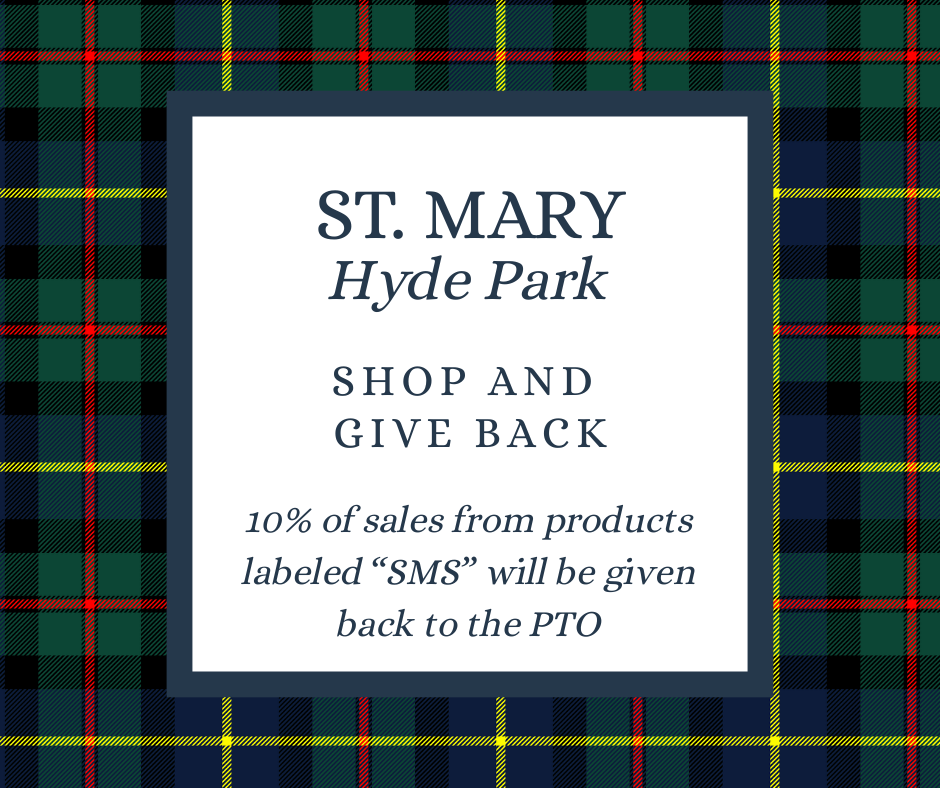 Sweet purchases that do sweet things. 10% of sales from products labeled "SMS" will be donated back to St. Mary Hyde Park PTO to help our school grow and shine.
